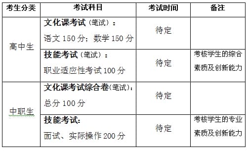 1. 文化考试+职业适应性考试,高中生总分400分,中职生总分300分。(非运动项目特长生)
