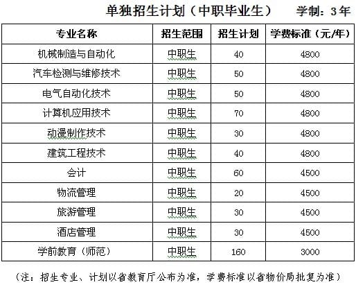 2018年单独招生总计划人数1650人(含运动项目特长生45人),其中高中毕业生计划1070人,中职毕业生计划580人。